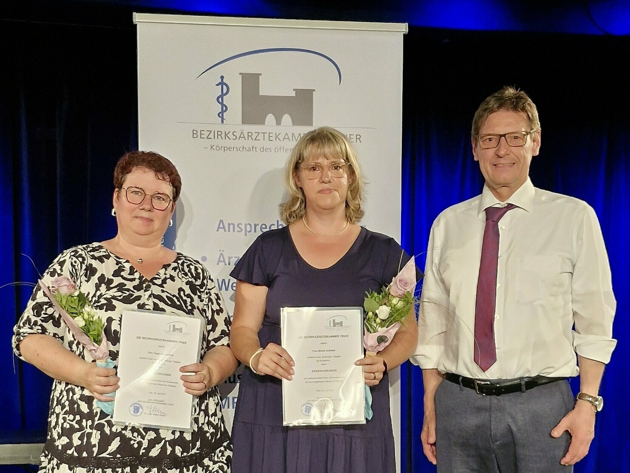 Im feierlichen Rahmen der Abschlussveranstaltung wurden auch langjährig engagierte Arzthelferinnen gewürdigt, die gemeinsam mit ihren Praxisleitern an der Lehrabschlussfeier teilnahmen. Aus der Hausarztpraxis von Herrn Dr. med. Dirk Hagenburger und Herrn Christian Kühn erhielten Frau Nicole Schmidt für 30 Jahre engagierte Mitarbeit sowie Frau Tanja Haupenthal für über 25 Jahre treuen Dienst eine besondere Anerkennung.